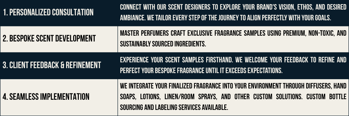 Tailored Excellence: Exclusive bespoke fragrance creations that authentically reflect your brand's identity and vision.
